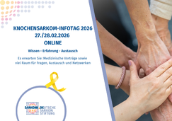 Erleben Sie, dass niemand allein ist mit der Diagnose Knochensarkom! Die Deutsche Sarkom-Stiftung lädt Sie herzlich zum 1. Knochensarkom-Infotag 2026 Online am 27./28. Februar 2026 ein. Das Programm wurde gemeinsam mit Patient:innen/Angehörigen entwickelt und wird viel Raum für Erfahrungsaustausch bieten. In der Online-Veranstaltung gaben führende medizinische Experten ihr Wissen aktuell, verständlich und praxisnah weiter – zur Stärkung der Patientenkompetenz.